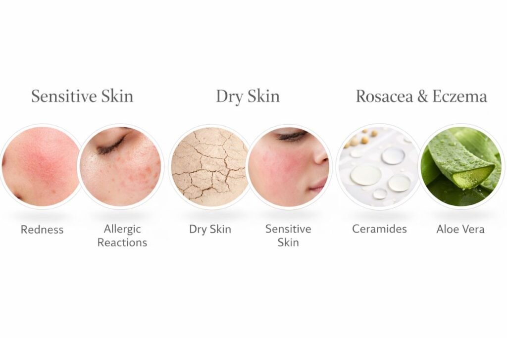 - Sensitive Skin: Naturally prone to irritation, redness, and allergic reactions. Ingredients like fragrances, alcohols, and harsh exfoliants may trigger flare-ups.