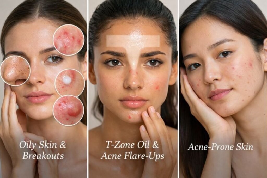 - Combination skin with excess oil in the T-zone and acne flare-ups