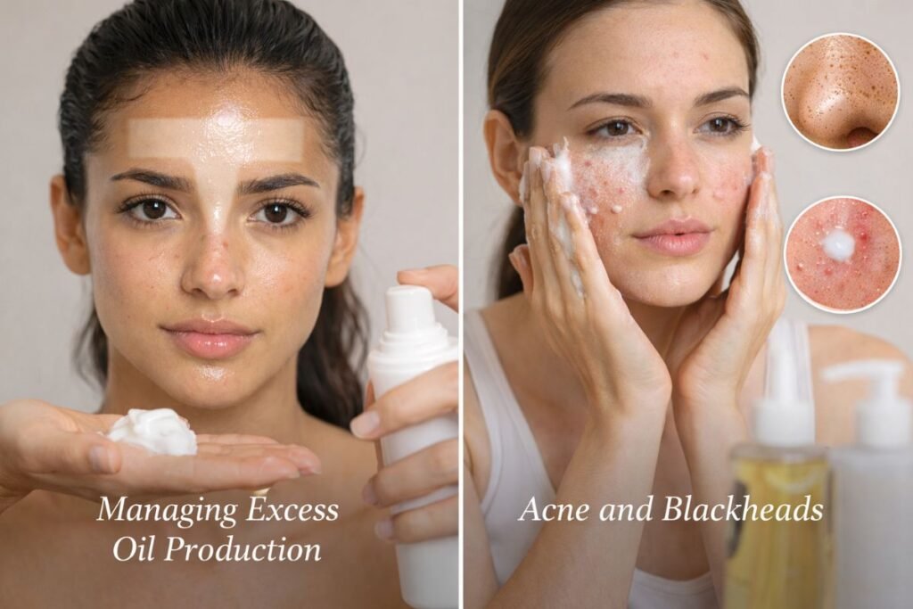 Over-cleansing can actually cause more oil production. Use a gentle foaming or gel cleanser designed to balance oil production. Opt for cleansers with niacinamide, which helps regulate oil production over time.