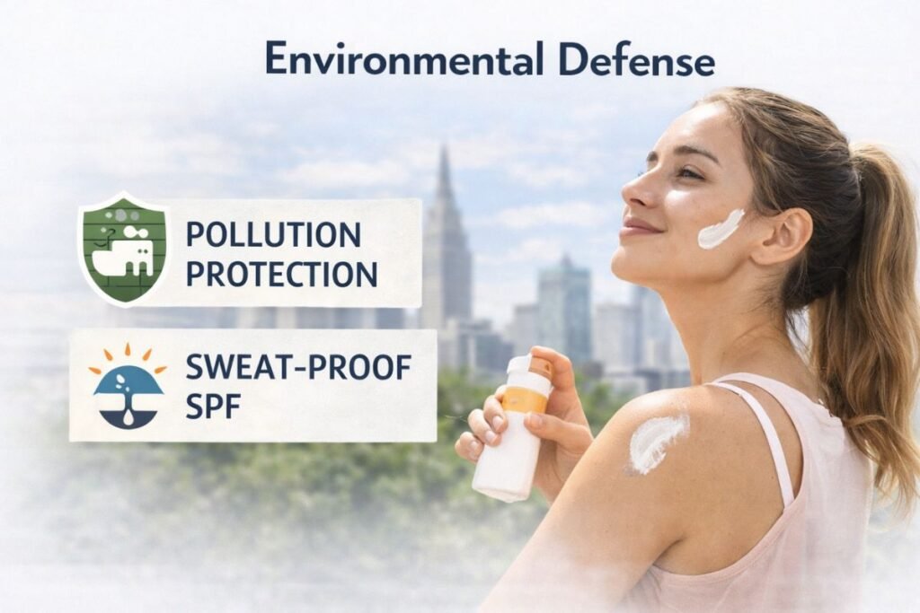 Protect your skin from environmental pollutants with antioxidants like Vitamin C and green tea extract. Use sweat-proof SPF for added protection when you’re on the go.