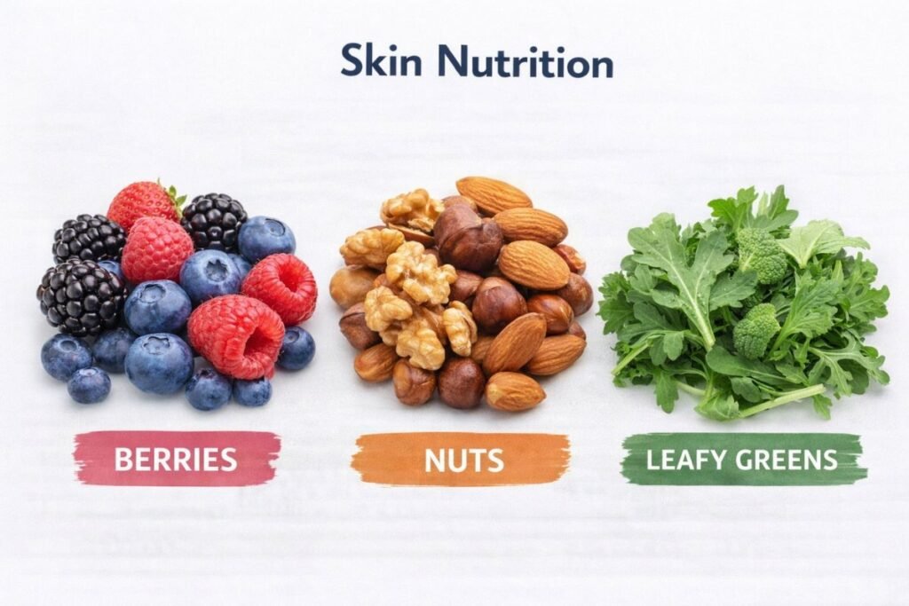 Antioxidants are crucial for glowing skin, so focus on foods like berries, nuts, and green leafy vegetables. These foods help reduce inflammation and improve skin texture.