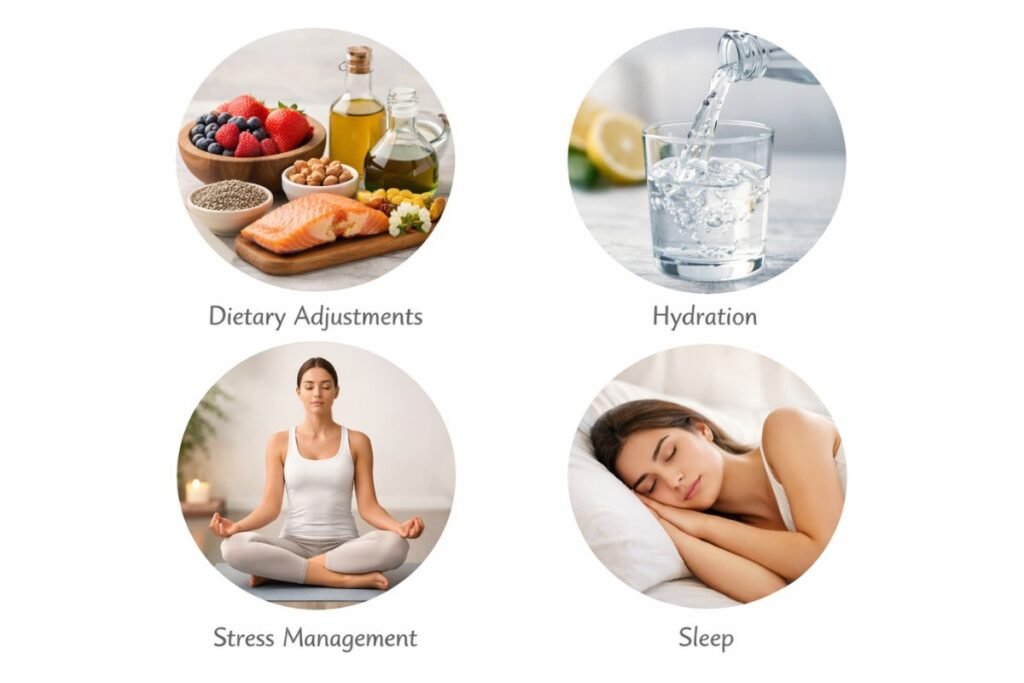 • Dietary Adjustments: Limit high-glycemic foods (like sugary snacks) and dairy, which may worsen acne. Increase consumption of antioxidant-rich foods and omega-3s like berries, nuts, and fatty fish.