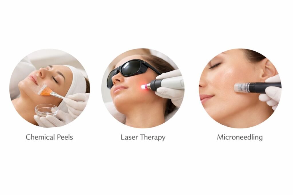 • Microneedling: Tiny needles puncture the skin, stimulating collagen production and helping reduce acne scars and oil production.