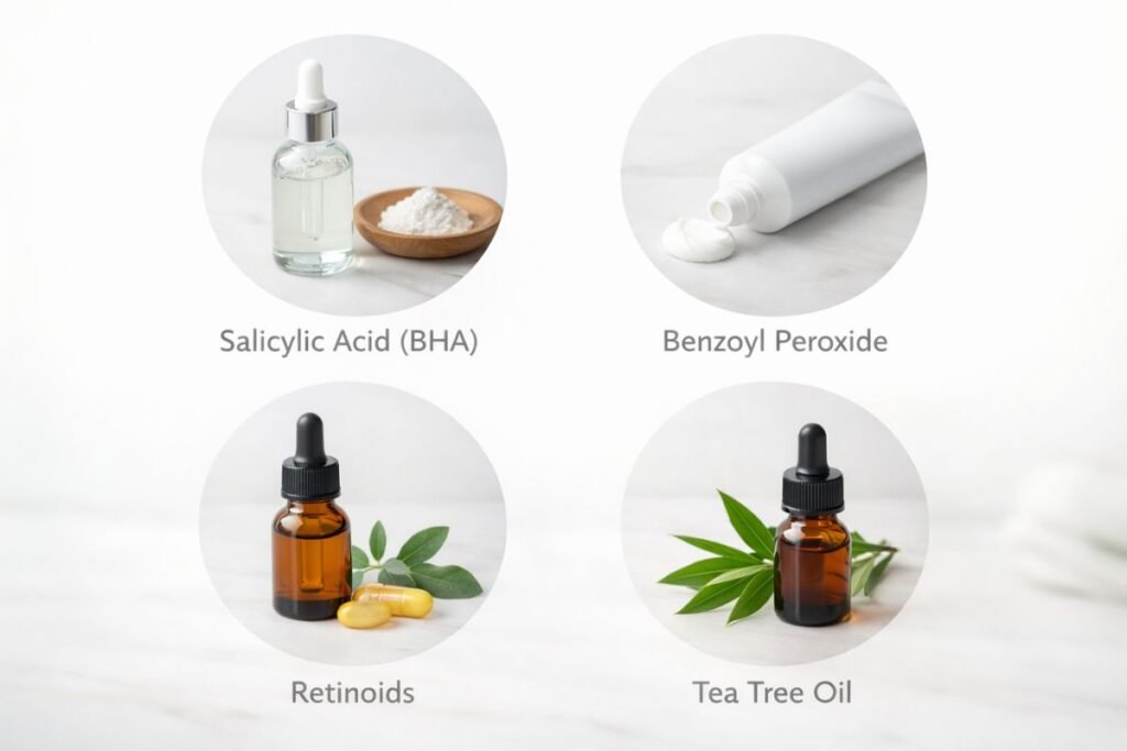 • Benzoyl Peroxide: This antibacterial agent reduces acne-causing bacteria, helping prevent new pimples. It can be drying, so use it sparingly.