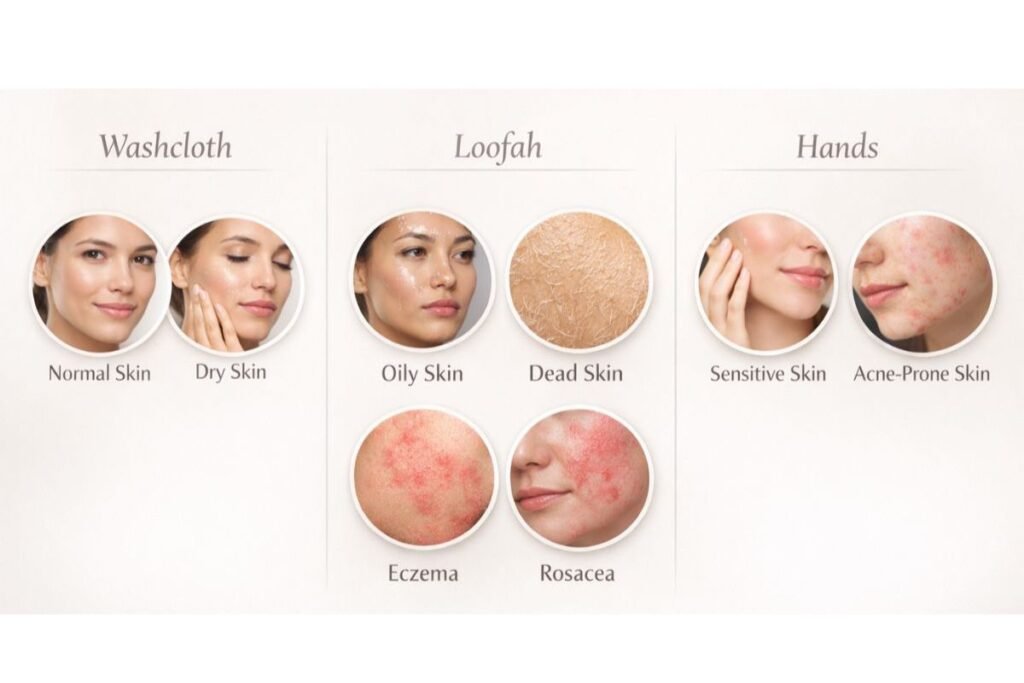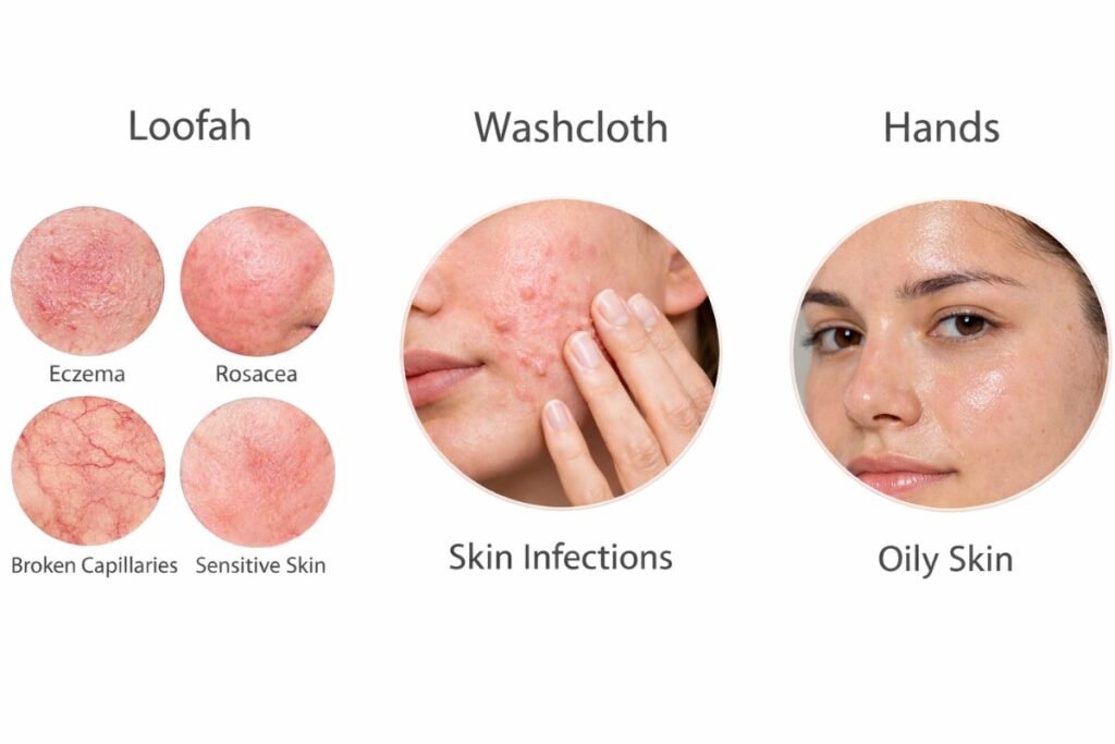 For sensitive skin, hands are usually the gentlest option. A washcloth provides mild exfoliation, making it ideal for normal to dry skin.